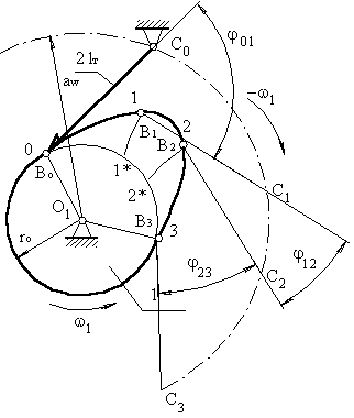 радиус которой равен расстоянию между тО1 и тС: r = aw. Точка пере сечения т.С1 – положение оси вращения толкателя в обращенном движении,